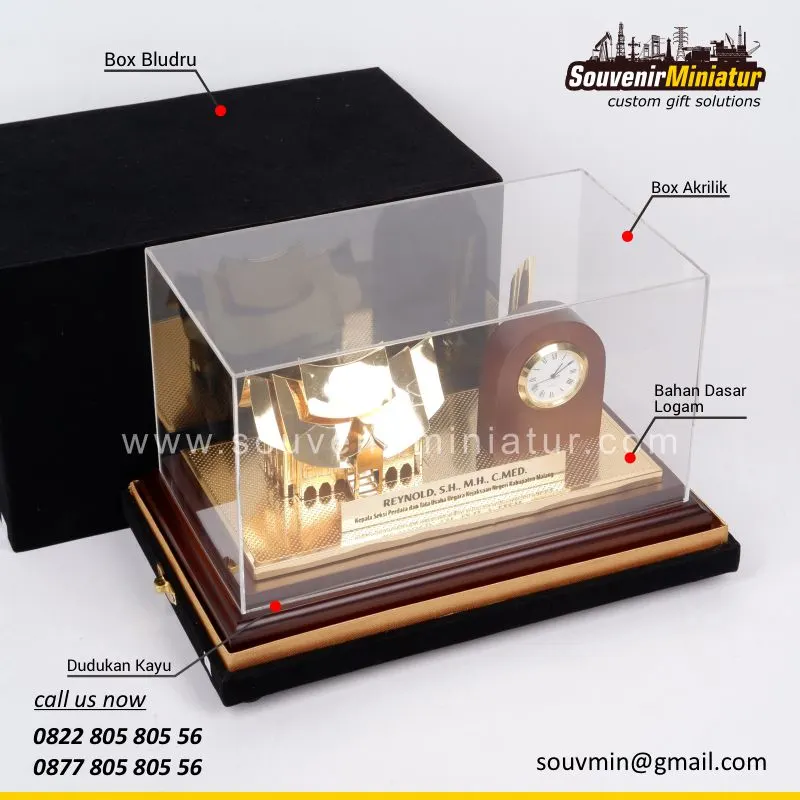 Miniatur Kejari Malang berbentuk Rumah Gadang ini dirancang dengan detail elegan, dilengkapi jam klasik dan pen holder yang fungsional. Kombinasi tersebut menjadikannya tidak hanya sebagai simbol penghargaan, tetapi juga elemen dekoratif meja kerja yang berkelas dan penuh makna.