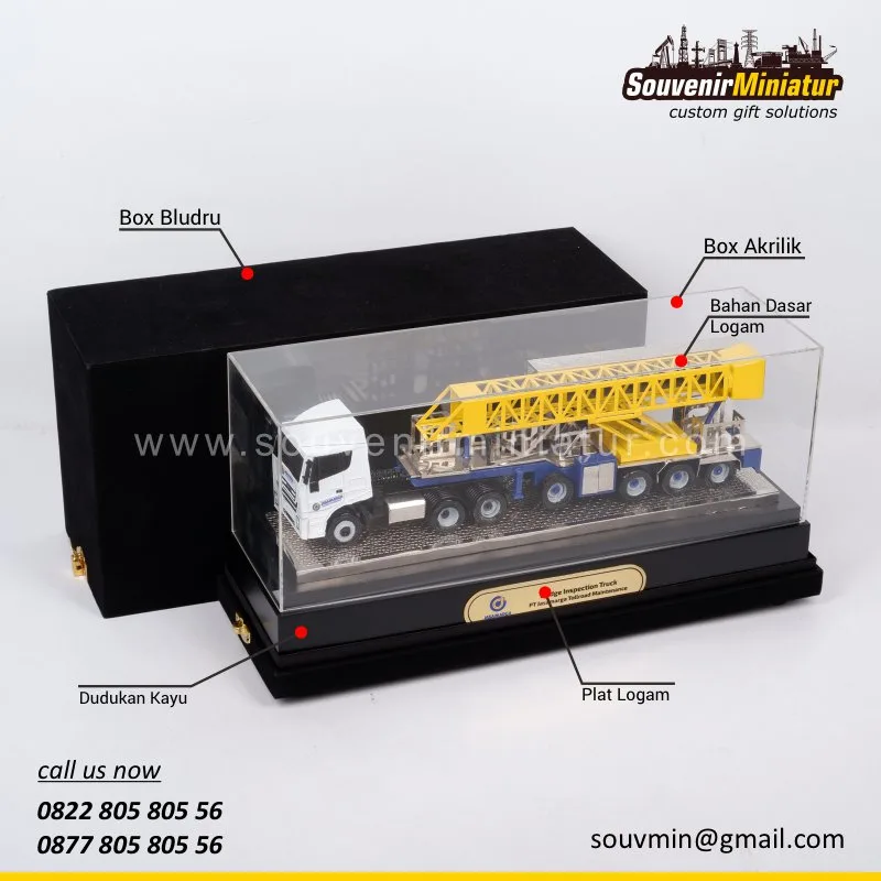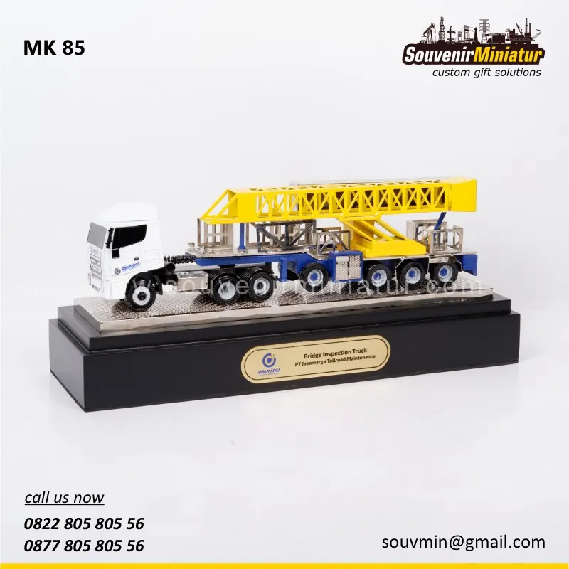 Miniatur Bridge Inspection Truck menghadirkan replika kendaraan tersebut dengan detail yang presisi. Desainnya menampilkan struktur arm dan kendaraan secara realistis, menjadikannya cendera mata eksklusif yang merepresentasikan dedikasi dalam pemeliharaan infrastruktur.