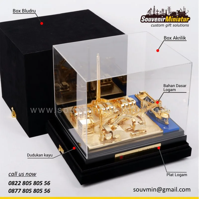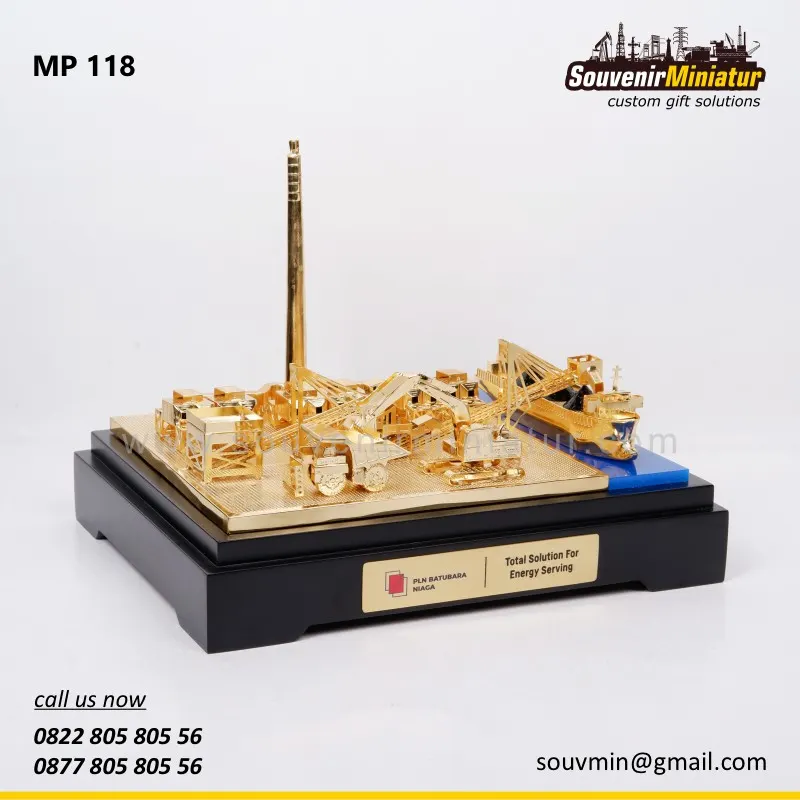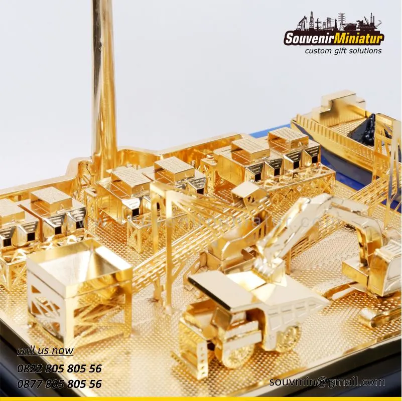 Miniatur PLN Batubara Niaga ini menghadirkan detail area industri dan fasilitas energi dalam balutan warna emas elegan, merepresentasikan profesionalisme, pencapaian, dan kebanggaan perusahaan secara visual yang presisi, kokoh, dan bernilai tinggi.