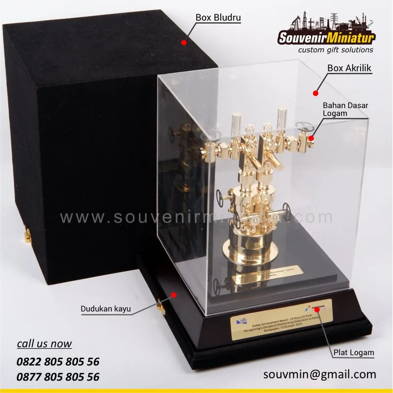 Miniatur Safety Achievement Award ini merepresentasikan instalasi industri dengan detail presisi berlapis warna emas, berdiri kokoh di atas base hitam elegan, mencerminkan prestasi, dedikasi tim, serta nilai keselamatan yang dijunjung tinggi perusahaan.